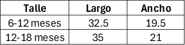 Tabla de medidas de referencia. Las medidas son aproximadas y pueden tener un margen de diferencia del 10% con la tabla. Las medidas están expresadas en centímetros.