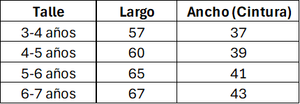 Tabla de medidas de referencia. Las medidas son aproximadas y pueden tener un margen de diferencia del 10% con la tabla. Las medidas están expresadas en centímetros.