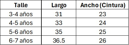 Tabla de medidas de referencia. Las medidas son aproximadas y pueden tener un margen de diferencia del 10% con la tabla. Las medidas están expresadas en centímetros.