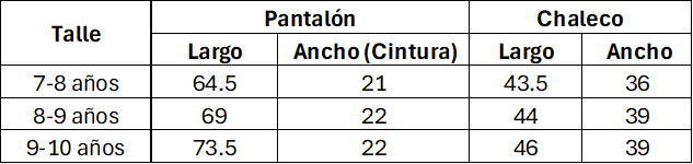 Tabla de medidas de referencia. Las medidas son aproximadas y pueden tener un margen de diferencia del 10% con la tabla. Las medidas están expresadas en centímetros.