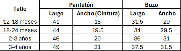 Tabla de medidas de referencia. Las medidas son aproximadas y pueden tener un margen de diferencia del 10% con la tabla. Las medidas están expresadas en centímetros.