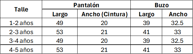 Tabla de medidas de referencia. Las medidas son aproximadas y pueden tener un margen de diferencia del 10% con la tabla. Las medidas están expresadas en centímetros.