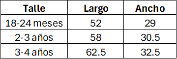 Tabla de medidas de referencia. Las medidas son aproximadas y pueden tener un margen de diferencia del 10% con la tabla. Las medidas están expresadas en centímetros.
