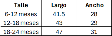 Tabla de medidas de referencia. Las medidas son aproximadas y pueden tener un margen de diferencia del 10% con la tabla. Las medidas están expresadas en centímetros.