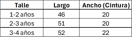 Tabla de medidas de referencia. Las medidas son aproximadas y pueden tener un margen de diferencia del 10% con la tabla. Las medidas están expresadas en centímetros.