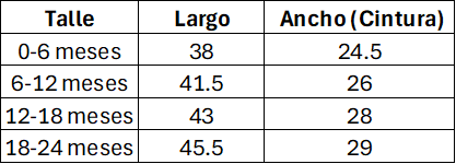 Tabla de medidas de referencia. Las medidas son aproximadas y pueden tener un margen de diferencia del 10% con la tabla. Las medidas están expresadas en centímetros.