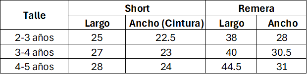 Tabla de medidas de referencia. Las medidas son aproximadas y pueden tener un margen de diferencia del 10% con la tabla. Las medidas están expresadas en centímetros.