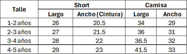 Tabla de medidas de referencia. Las medidas son aproximadas y pueden tener un margen de diferencia del 10% con la tabla. Las medidas están expresadas en centímetros.