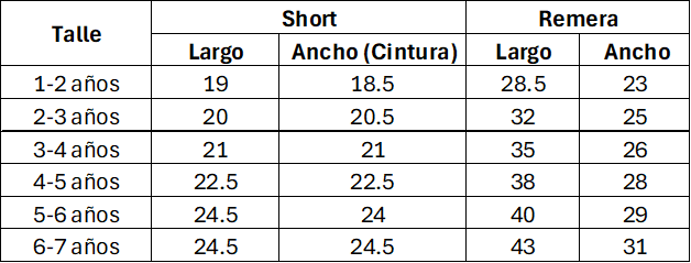 Tabla de medidas de referencia. Las medidas son aproximadas y pueden tener un margen de diferencia del 10% con la tabla. Las medidas están expresadas en centímetros.
