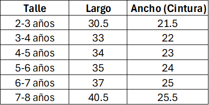 Tabla de medidas de referencia. Las medidas son aproximadas y pueden tener un margen de diferencia del 10% con la tabla. Las medidas están expresadas en centímetros.