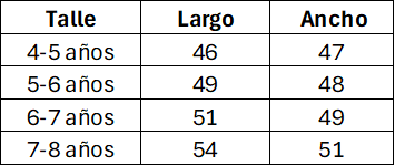 Tabla de medidas de referencia. Las medidas son aproximadas y pueden tener un margen de diferencia del 10% con la tabla. Las medidas están expresadas en centímetros.