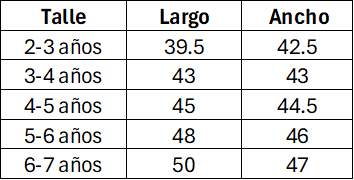 Tabla de medidas de referencia. Las medidas son aproximadas y pueden tener un margen de diferencia del 10% con la tabla. Las medidas están expresadas en centímetros.