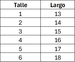 Tabla de medidas de referencia. Las medidas son aproximadas y pueden tener un margen de diferencia del 10% con la tabla. Las medidas están expresadas en centímetros.