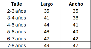 Tabla de medidas de referencia. Las medidas son aproximadas y pueden tener un margen de diferencia del 10% con la tabla. Las medidas están expresadas en centímetros.