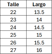 Tabla de medidas de referencia. Las medidas son aproximadas y pueden tener un margen de diferencia del 10% con la tabla. Las medidas están expresadas en centímetros.