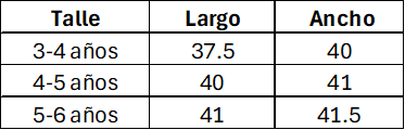 Tabla de medidas de referencia. Las medidas son aproximadas y pueden tener un margen de diferencia del 10% con la tabla. Las medidas están expresadas en centímetros.