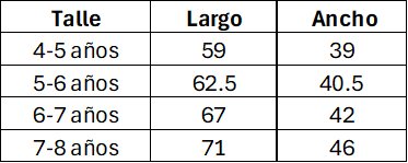 Tabla de medidas de referencia. Las medidas son aproximadas y pueden tener un margen de diferencia del 10% con la tabla. Las medidas están expresadas en centímetros.
