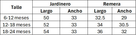 Tabla de medidas de referencia. Las medidas son aproximadas y pueden tener un margen de diferencia del 10% con la tabla. Las medidas están expresadas en centímetros.