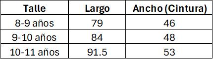 Tabla de medidas de referencia. Las medidas son aproximadas y pueden tener un margen de diferencia del 10% con la tabla. Las medidas están expresadas en centímetros.