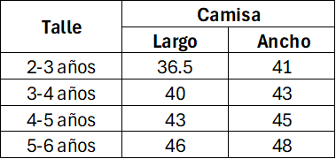 Tabla de medidas de referencia. Las medidas son aproximadas y pueden tener un margen de diferencia del 10% con la tabla. Las medidas están expresadas en centímetros.
